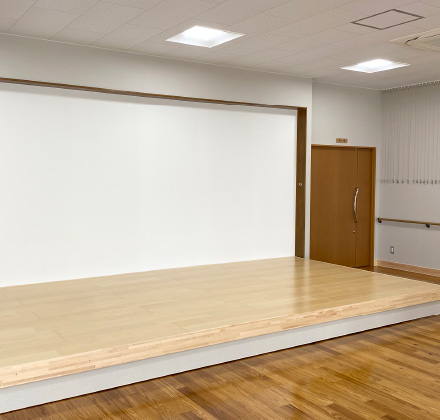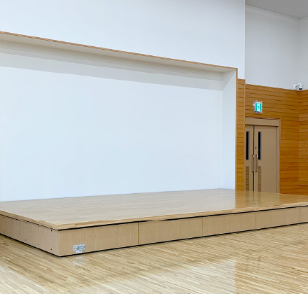 可動ステージには、壁面収納ステージ、移動式ポータブルステージ、昇降ステージなどの種類がありますが、なかでも壁面収納ステージは、壁に収納するタイプのため収納スペースが少なく、固定ステージとも遜色のない安定感があり、床のバリアフリーもしっかり保ちます。