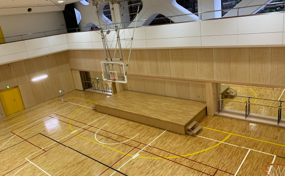 ステージ収納時は、体育の授業や部活動、競技大会など、スポーツをメインに行なう場所として使用されます。ステージを収納すると、固定舞台ではできなかったバスケットボールコート2面の確保、バスケットボール部とバレーボール部が同時使用できるなどのメリットが生まれます。