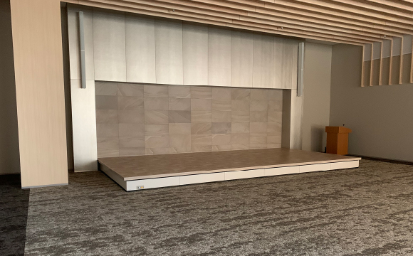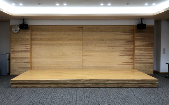 大きなホールや大会議室では、大型や中型の電動ステージが導入されます。小会議室や研修室、食堂では小型の手動ステージが導入されています。